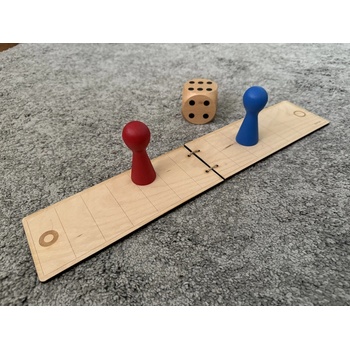 Drevenú doštičku - vyrobenú a gravírovanú z preglejky o sile 5mm. Rozmery: 45 x 9 cm - rozdelená na polovicu. 2 drevené hracie figúrky - výška figúrky 8 cm. Farebné prevedenie podľa aktuálnej dostupnosti. 1 drevená hracia kocka - 5,4 x 5,4x 5,4 cm.